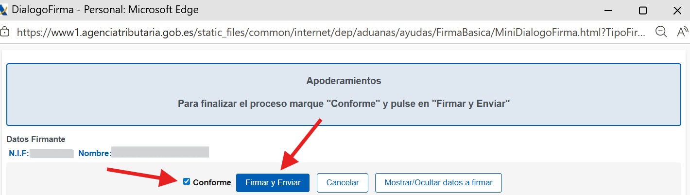 On the confirmation screen, verify all the information, and click “Firmar y Enviar” (Sign and Submit).