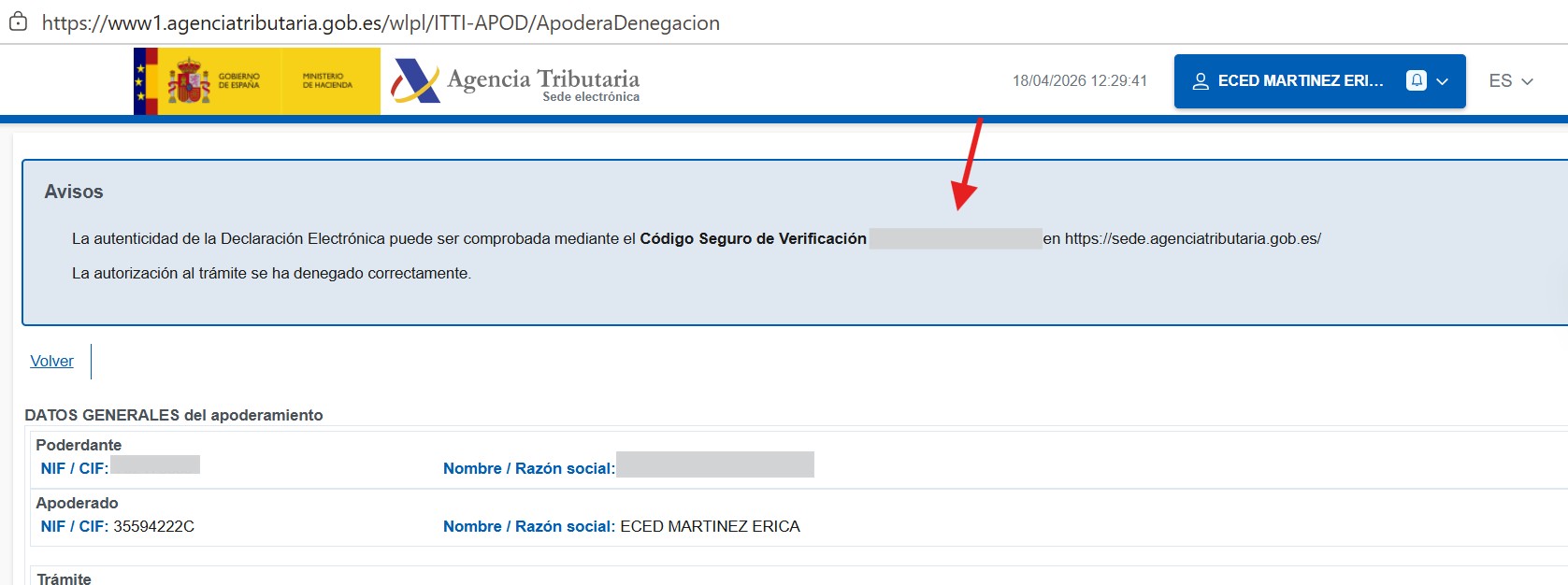 - La autenticidad de la Declaración Electrónica puede ser comprobada mediante el Código Seguro de Verificación + (CODE THAT YOU CAN CHECK VALIDITY UNDER https://sede.agenciatributaria.gob.es/Sede/en_gb/procedimientoini/ZZ05.shtml “